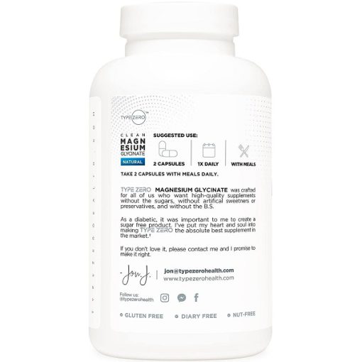 منیزیم گلیسینات تایپ زیرو Type Zero Magnesium Glycinate یک نوع مکمل منیزیم است که به خاطر جذب بهتر و اثربخشی بیشتر در مقایسه با برخی دیگر از اشکال منیزیم، محبوبیت دارد. از ویژگی های این محصول می توان به عدم وجود سویا، گلوتن، ژلاتین، مواد مصنوعی، قند، کربوهیدرات، محرک ها و آلرژن ها در فرمول اشاره کرد. این محصول از سلامت قلب، ماهیچه، مغز و غیره حمایت می کند. حداکثر سطح منیزیم با دوز بالای 420 میلی گرم منیزیم گلیسینات را فراهم می کند.