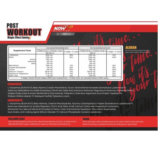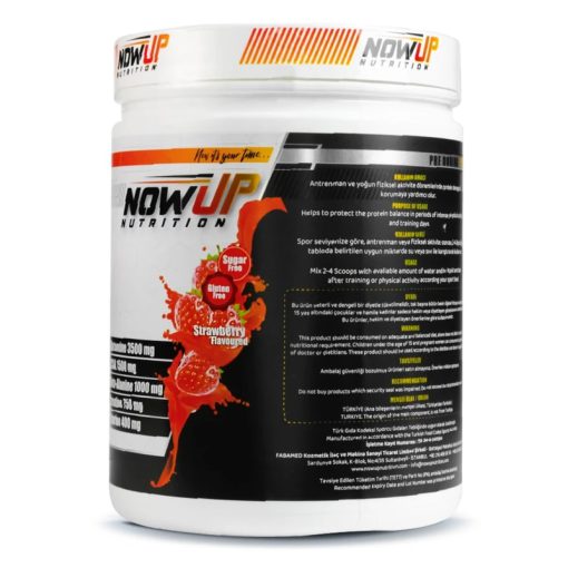 ال-گلوتامین، BCAA (4: 1: 1)، بتا آلانین، کراتین مونوهیدرات، تائورین، کمپلکس کربوهیدرات (ایزومالتولوز، [palatinose™]، دکستروز، مالتودکسترین)، تنظیم کننده اسیدیته (اسید سیتریک، اسید مالیک)، کلسیم حاوی جوش شیرین، کربنات منیزیم، آهن عنصری، طعم دهنده طبیعی توت فرنگی، رنگ دهنده (کارموزین)، شیرین کننده (سوکرالوز-آسپارتام)، صمغ عربی، ضد جوش (سیلیکون دی اکسید-شیرین کننده تری کلسیم).