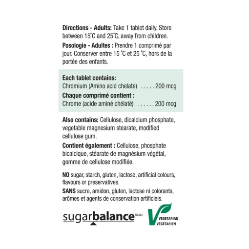 کروم (کلات اسید آمینه): 200 میکروگرم در هر قرص، که بهعنوان دوز ایدهآل برای حمایت از سلامت متابولیسم شناخته شده است.