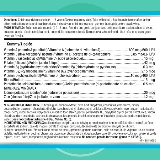 برای کودکان و نوجوانان بین 4 تا 13 سال، روزانه یک پاستیل از این مولتی ویتامین همراه با غذا توصیه میشود. لازم است که کودکان به خوبی آدامس را بجوند تا از بهرهمندی کامل از ترکیبات آن مطمئن شوند. همچنین مصرف این مولتی ویتامین باید چند ساعت قبل یا بعد از مصرف سایر داروها صورت گیرد تا از تداخلات احتمالی جلوگیری شود.