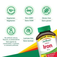 آهن به تنهایی برای جذب بهتر نیاز به عناصر دیگری مانند ویتامین C دارد. Jamieson Gentle Iron شامل ویتامین C است که به طور طبیعی جذب آهن را افزایش میدهد. همچنین، وجود ویتامینهای گروه B مانند B12 و اسید فولیک به بهبود جذب و انتقال آهن به سلولهای خونی کمک میکند.