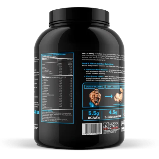 پروتئین وی ایزوله مکسس 1.82 کیلوگرم MAX’s WHEY ISOLATES یک مکمل پروتئینی با کیفیت بسیار بالا است که برای افرادی که هدفشان ساخت عضلات خشک و بدون چربی است ساخته شده است. این محصول حاوی پروتئین وی ایزوله و پپتیدهای هیدرولیز شده وی است که هردوی آنها از بهترین انواع پروتئین برای ساخت عضله محسوب میشوند.