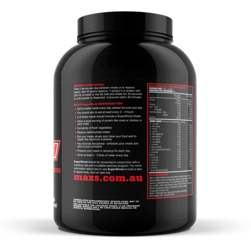 برای بهرهبرداری از مزایای MAX’S Super Shred System، مصرف 1 تا 2 سروینگ در روز توصیه میشود. برای هر سروینگ، 30 گرم (تقریباً 1 پیمانه) از پودر را با 200 میلیلیتر آب یا شیر کمچرب مخلوط کنید و به مدت 30 ثانیه خوب هم بزنید. بهتر است مصرف مکمل را در میان وعدهها یا به عنوان جایگزین وعدههای غذایی انجام دهید. مصرف آن را در 30 دقیقه پس از آمادهسازی انجام دهید.
