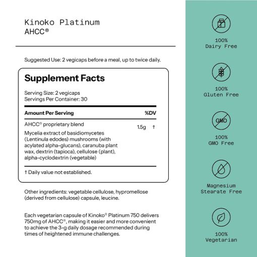 سایر مواد تشکیل دهنده: سلولز گیاهی و لوسین. هر کپسول گیاهی Kinoko® Platinum AHCC® 750 میلیگرم AHCC® را ارائه میکند، که دستیابی به دوز 3 گرم روزانه توصیه شده در زمانهای افزایش چالشهای ایمنی را آسانتر و راحتتر میکند.