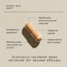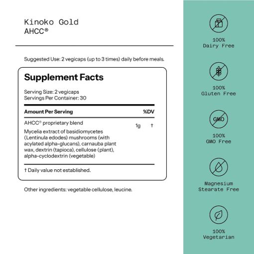 هر کپسول کینوکو گلد AHCC آمریکایی حاوی 500 میلی گرم AHCC است. یک وعده شامل 2 کپسول است که 1 گرم AHCC را فراهم می کند. AHCC® بهعنوان تقویت کننده سیستم ایمنی بدن شناخته می شود. با افزایش تعداد و فعالیت گلبولهای سفید خون در بدن عمل میکند. AHCC® فعالیت سلولهای کشنده طبیعی، اولین خط دفاعی بدن را تا 300-800% افزایش میدهد. این محصول دارای مزایای متعددی است که از این بین می توان به موارد زیر اشاره کرد: