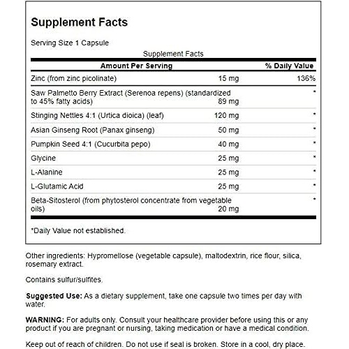 ترکیب گیاهی قدرتمند: هر یک از کپسولهای سوانسون که به راحتی بلعیده میشوند، 15 میلیگرم روی، 89 میلیگرم عصاره توت نخل اره، غلظت 4:1 برگ گزنه و سایر مواد قدرتمند حاوی مواد مغذی حیاتی برای حمایت از سلامت پروستات ارائه میکنند.