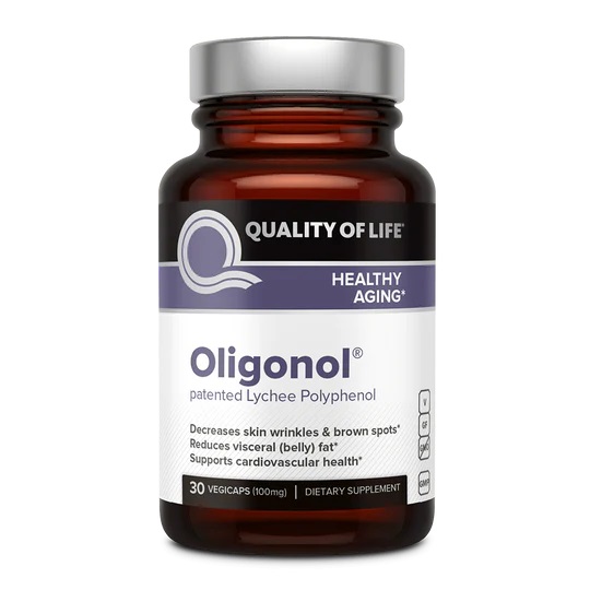 با الیگونول کوالیتی اف لایف به طور شگفت انگیزی پیر شوید. الیگونول® ساخته شده از میوه لیچی و چای سبز، پیری را در منبع خود هدف قرار می دهد تا چین و چروک های پوست و لکه های قهوه ای را کاهش دهد. مکمل کوالیتی اف لایف خستگی را کاهش، چربی احشایی (شکم) را کاهش و از سلامت قلب و عروق حمایت می کند.
