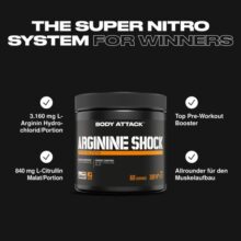 مصرف روزانه 2 تا 5 گرم حداکثر در روز تأثیر مثبتی بر اهداف رشد عضلات شما دارد. آرژنین شوک بادی اتک حاوی 2.6 گرم در هر دوز روزانه است. سیترولین پیش ساز اسید آمینه آرژنین است و تجزیه آن را در بدن شما به تاخیر می اندازد. هر چه رگ های خونی شما در اثر این اثر گشادتر شوند، پمپاژ شما در طول تمرین بیشتر میشود.
