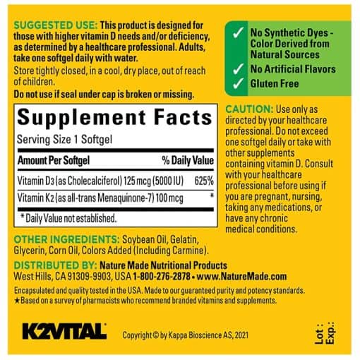 ویتامین د3 و کا2 نیچرمید 30 عددی با مواد مغذی ایده آل به تقویت سلامت استخوان های خود کمک می کند. ویتامین D3 از سیستم ایمنی، استخوان، دندان و سلامت ماهیچه ها حمایت می کند. ویتامین K2 از عملکرد سالم شریان پشتیبانی می کند.