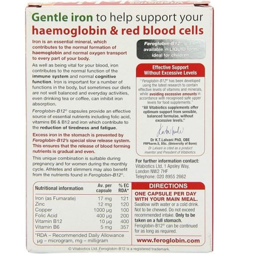 کپسول فروگلوبین ویتابیوتیکس یکی از پرفروشترین و محبوبترین مکملهای آهن در دنیا است که توسط برند معتبر Vitabiotics انگلستان تولید میشود. این مکمل با فرمولاسیونی علمی و پیشرفته، ترکیبی متعادل از آهن، فولیک اسید، ویتامین B12 و روی را ارائه میدهد تا به بهبود انرژی، نشاط، تقویت سیستم ایمنی و رفع کمخونی کمک کند.