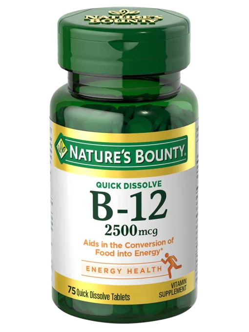 هر قرص کوئیک دیزالو نیچرز بونتی حاوی 2500 میکروگرم ویتامین B12 (سیانوکوبالامین) است که معادل 41667 درصد از نیاز روزانه بدن است. این مقدار بالا برای جبران کمبودهای تغذیهای، بهویژه در افراد گیاهخوار یا دارای رژیمهای خاص بسیار مفید است.