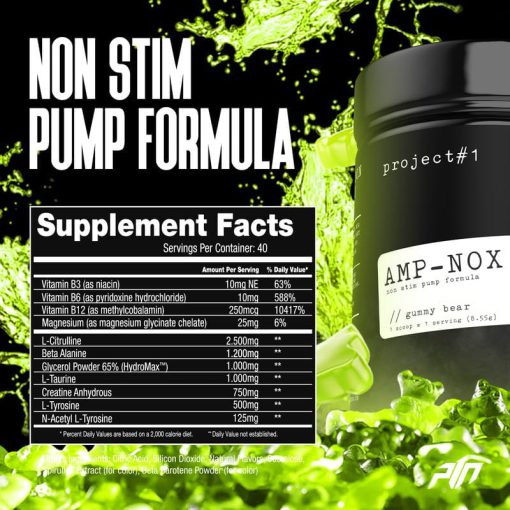 پمپ پروجکت وان بدون کافئین Project #1 AMP-NOX یک مکمل قبل از تمرین بدون کافئین است که با ترکیبی از ال-سیترولین، ال-تیروزین، ن-استیل ال-تیروزین و آمینواسیدهای ضروری طراحی شده تا ورزشکاران بتوانند بیشترین بهره را از تمرینات خود ببرند، بدون اینکه دچار بیخوابی، اضطراب یا لرزش ناشی از محرکها شوند.