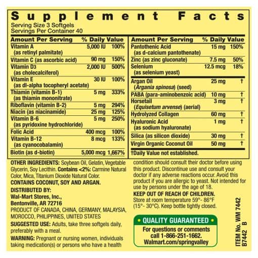 پوست، مو و ناخن اسپرینگ والی 120 عددی با حمایت کلاژنی و 5000 میلی گرم بیوتین همراه با فرمولاسیون ویژه با روغن آرگان، روغن نارگیل و کلاژن است. بیوتین به حمایت از مو و پوست سالم کمک می کند و این مکمل 5000 میکروگرم بیوتین در هر وعده را فراهم می کند.