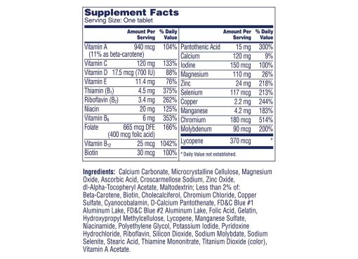 این مولتی ویتامین روزانه حاوی ویتامین های A، C و E، روی، سلنیوم، مس و منگنز برای حمایت از سلامت سلولها است. این مکمل برای حمایت از موارد زیر فرموله شده است: سلامت سلول، سلامت قلب، فشار خون سالم، سلامت ایمنی، انرژی فیزیکی با کمک به تبدیل غذا به سوخت، و سلامت چشم.