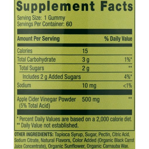 مکمل پاستیل سرکه سیب اسپرینگ والی 60 عددی بدون گلوتن، مخمر، تخم مرغ شیر، طعم دهنده های مصنوعی، مواد نگهدارنده اضافه شده، سویا، شیرین کننده های مصنوعی، شربت ذرت با فروکتوز بالا، رنگ های مصنوعی یا ژلاتین است.
