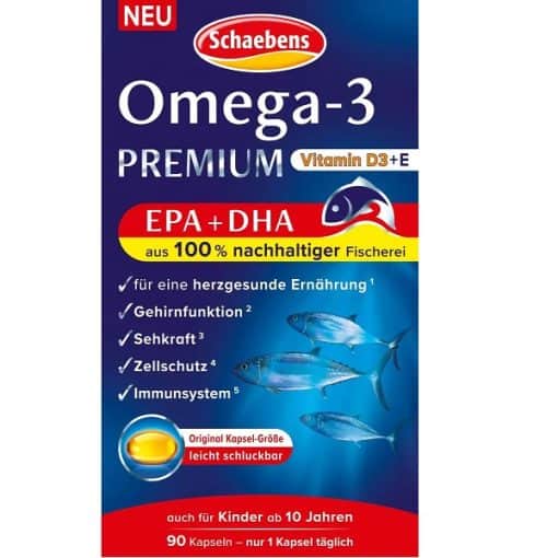 Schaebens Omega 3 Premium مکملی با پایه روغن ماهی با کیفیت بالا و غنی از اسیدهای چرب ضروری است. این محصول با دارا بودن حداقل 214 میلیگرم امگا 3 در هر کپسول و تقویتشده با 11 میلیگرم ویتامین E، ترکیبی ایدهآل برای تقویت عملکرد قلب، مغز و محافظت از سلولها در برابر استرس اکسیداتیو محسوب میشود.