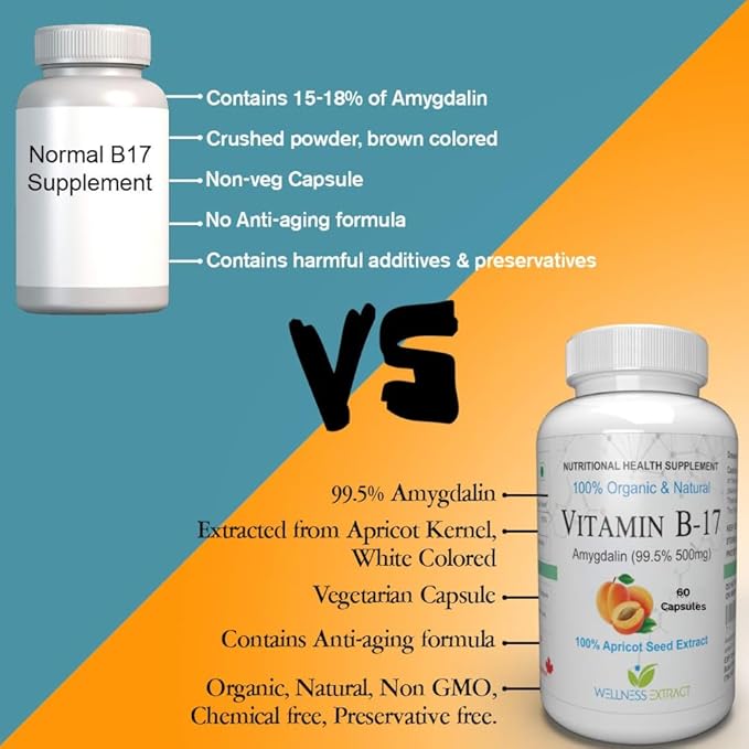 هر کپسول حاوی ۹۹.۵٪ ۵۰۰ میلیگرم ویتامین B17 خالص است که از هسته زردآلوی تلخ استخراج شده است.